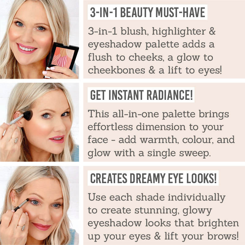 - A 3-in-1 blusher, highlighter & eye makeup for a radiant, multi-dimensional glow