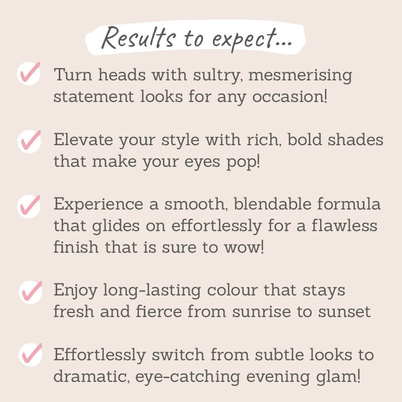 Results to expect: turn heads with sultry, mesmerising statement looks, elevate your style, smooth blendable formula, long-lasting cololur, swtch from subtle to dramatic eye catching everning glam