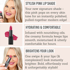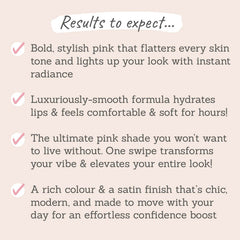 Results to expect: bold, stylish pink that flatters every skin tone, luxuriously-smooth formula hydrates lips, one swipe elevates your look, a rich colour & satin finihs that's chic and modern